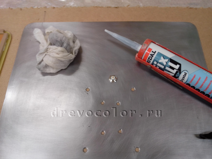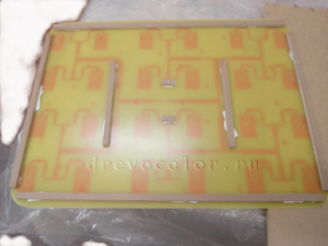Вот как мы поступим - приклеим кусочки напольного ламината 6 мм к рефлектору ТОНКИМ слоем клея. Перед этим, равномерно разместим их на стеклотекстолите с помощью двухстороннего скотча, см. фото 4 слева.