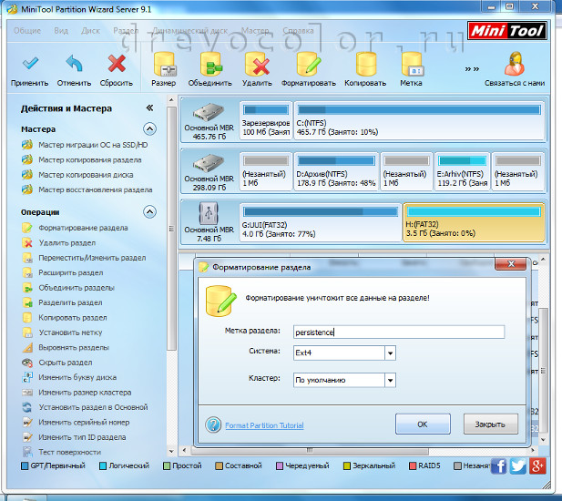Также, можно полностью подготовить USB-флэшку для сохранения изменений, не используя программу gparted. Воплотить в жизнь данный пример, нам поможет очень полезная программа Partition Wizard 9.1 - СКАЧАТЬ торрент файл: В программе выделяем флэшку с установленной Kali Linux 2.0 и жмём - «Разделить». Подвинув ползунок влево кликаем ОК. Выделяем созданный раздел, жмём «Форматировать» и в метке раздела пишем persistence, а файловая система - Ext4 -> OK. Чтобы наши действия исполнились, нажимаем синюю галочку "Применить". После выполнения ожидаемых операций, закрываем всё, выходим из windows и грузимся с этой же флэшки в Kali Linux 2.0, в режиме persistence ! Для того чтобы увидеть путь (название) нашей флэшки, в терминале пишем - # fdisk -l . Далее интуитивно как уже было описано выше: а) # mkdir -p /mnt/sdd1